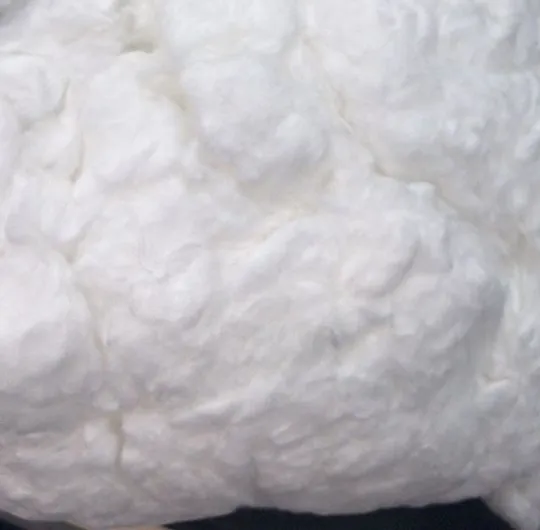 This raw fiber has been ginned, but has not been carded. There are cotton seeds and sometimes small pieces of the cotton plant mixed in. Raw cotton is often used for stuffing or cushioning when a less expensive material is required, and it’s acceptable to have some other plant matter besides the fiber.